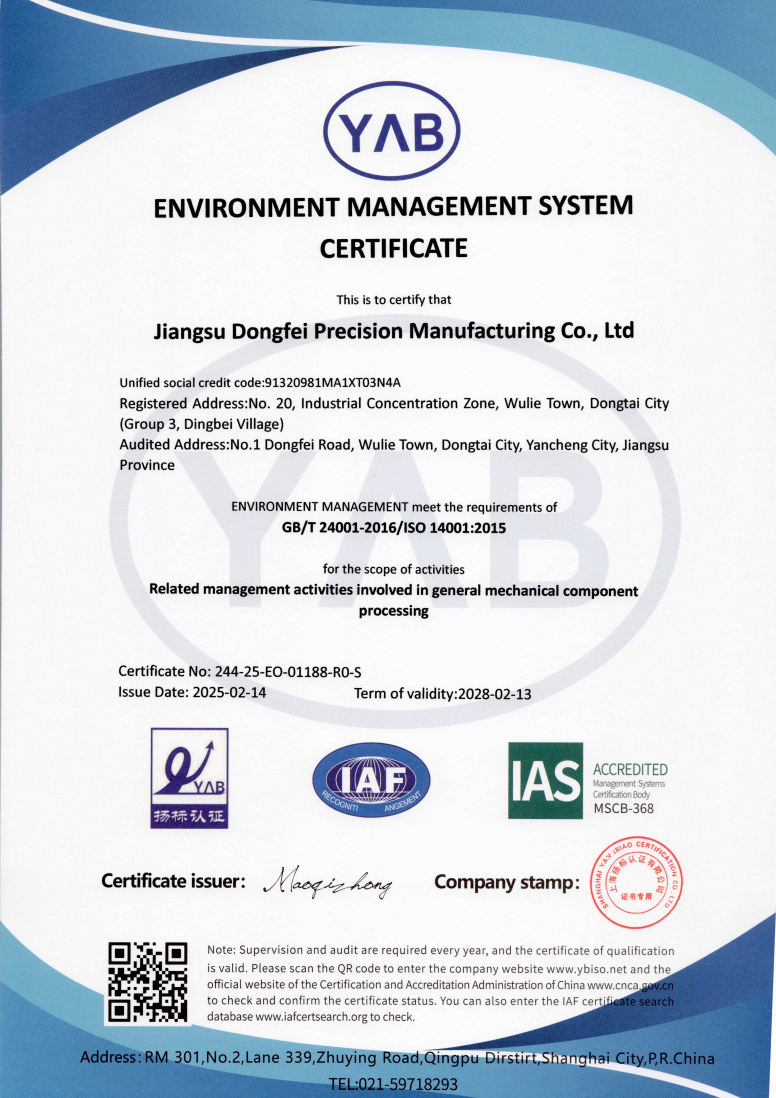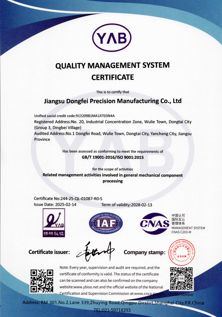 अब, जियांग्सू डोंगफेई के पास एक आधुनिक उत्पादन आधार है, जो आयातित सीएनसी खराद, स्वचालित सीएनसी खराद, मशीनिंग केंद्र, स्वचालित से सुसज्जित है। मिलिंग मशीनें, वायर-कट ईडीएम , जी रिंडिंग मशीनें और अन्य उपकरण , और इसमें टर्निंग, मिलिंग, ड्रिलिंग, ग्राइंडिंग और टैपिंग आदि सहित पूर्ण-प्रक्रिया प्रसंस्करण क्षमताएं हैं।
